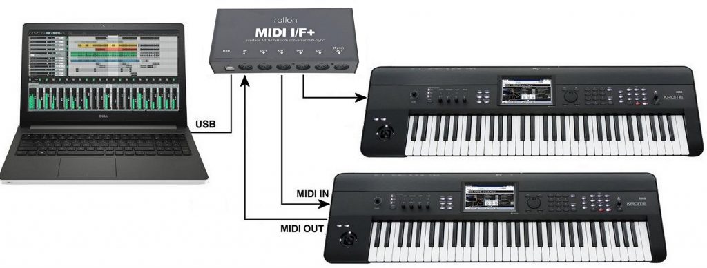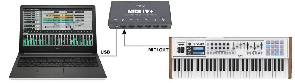 Uma vez conectada ao computador, a MIDI I/F+ aparece nas configurações do software como dispositivo de entrada e de saída, designada como “ratton I/F+”.