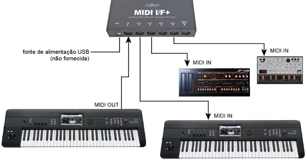 Não é necessário usar uma fonte de alimentação para a MIDI I/F+ operar como interface, pois a alimentação elétrica é feita através do cabo USB.