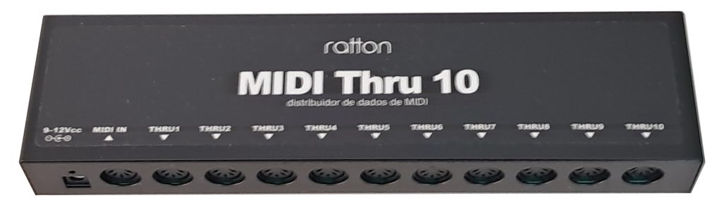 Distribui simultaneamente os dados de MIDI para vários equipamentos. Recebe os dados de MIDI do equipamento transmissor (“master”) e os retransmite, sem qualquer alteração, para até dez equipamentos.